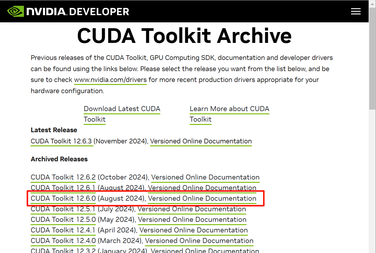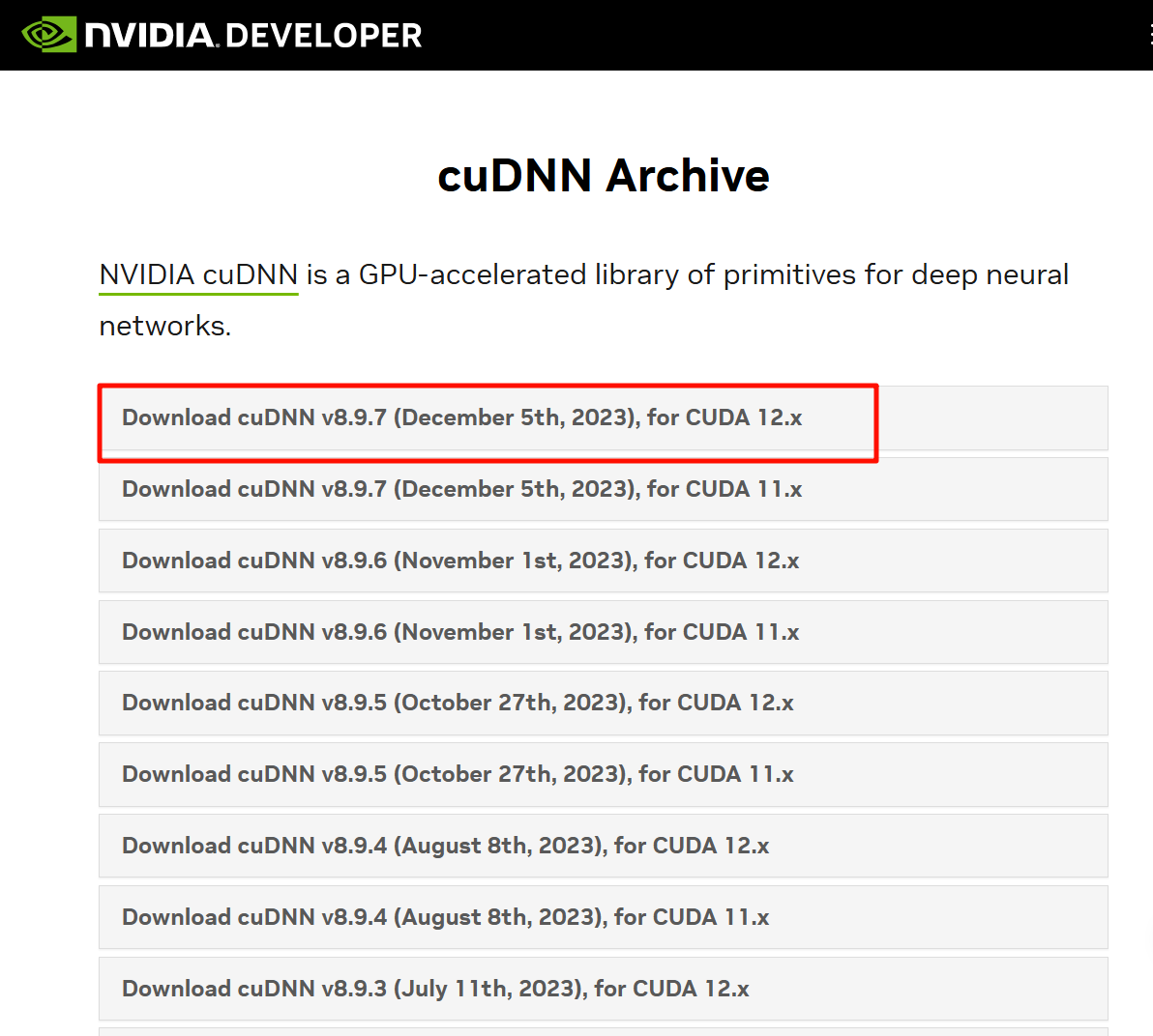首先我们需要千万cuDNN官网下载对应版本的cuDNN,由于我前一步下载的是12.6.0版本的cudatoolkit,那么这里我就下载12.x的版本: