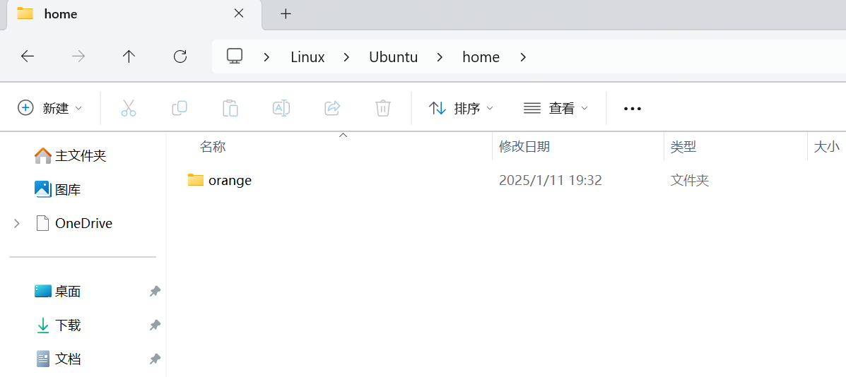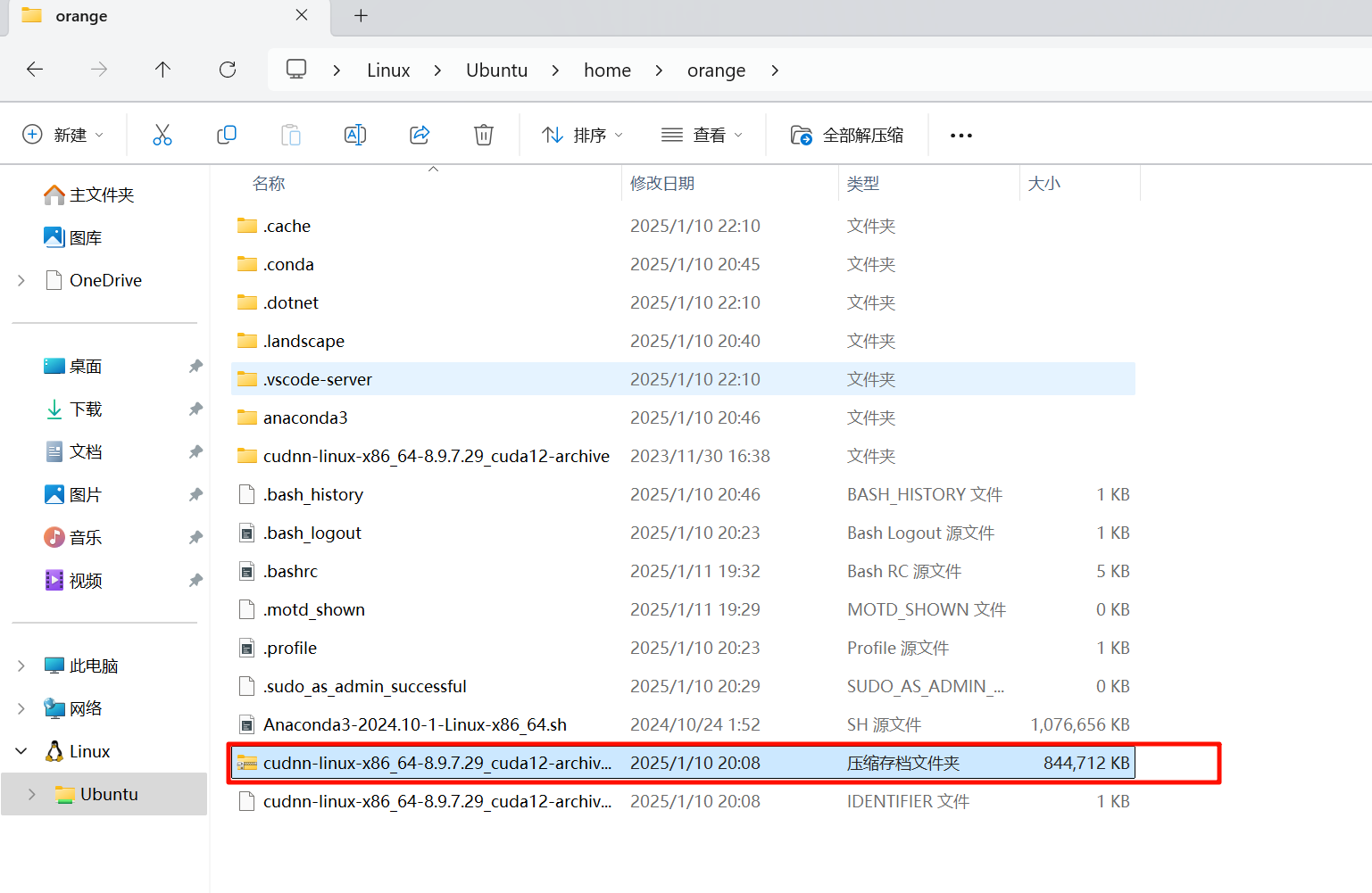 这一步操作之后我们会得到一个压缩包,接下来我们先不用解压,直接把这个压缩包复制到wsl的home文件夹下其中一个用户的文件夹里,例如我们home文件夹中有一个名为orange的用户,我们打开该文件夹并把压缩包复制到这个文件夹下: